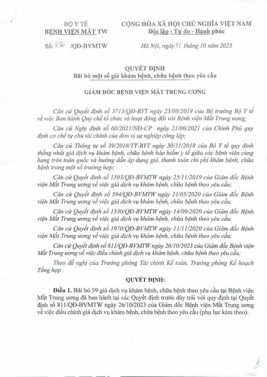 Quyết định ban hành giá dịch vụ Laser femtosecond điều trị tật khúc xạ