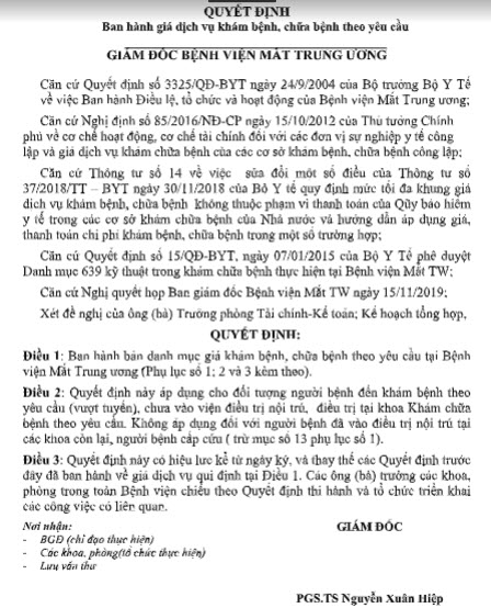 Bảng giá dịch vụ các dịch vụ y tế áp giá theo quyết định số 1953/QĐ-BVMTW ngày 25/11/2019 của Giám đốc Bệnh viện