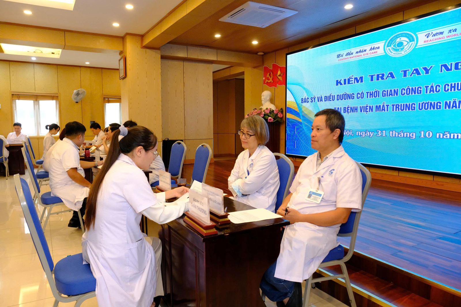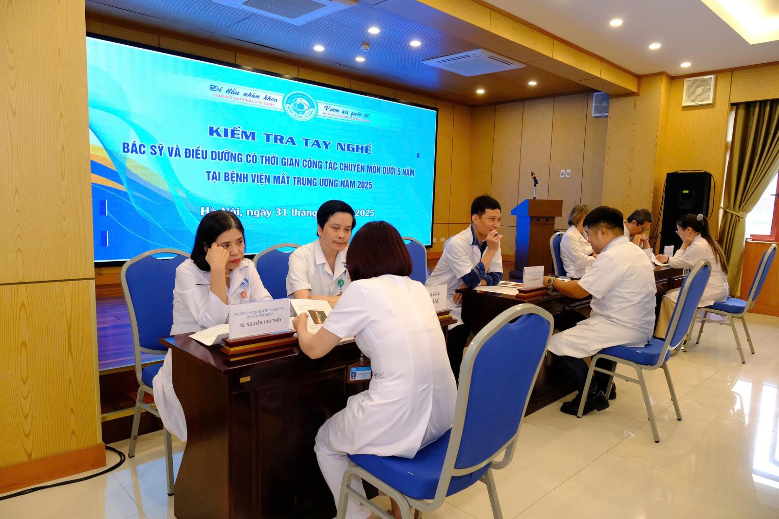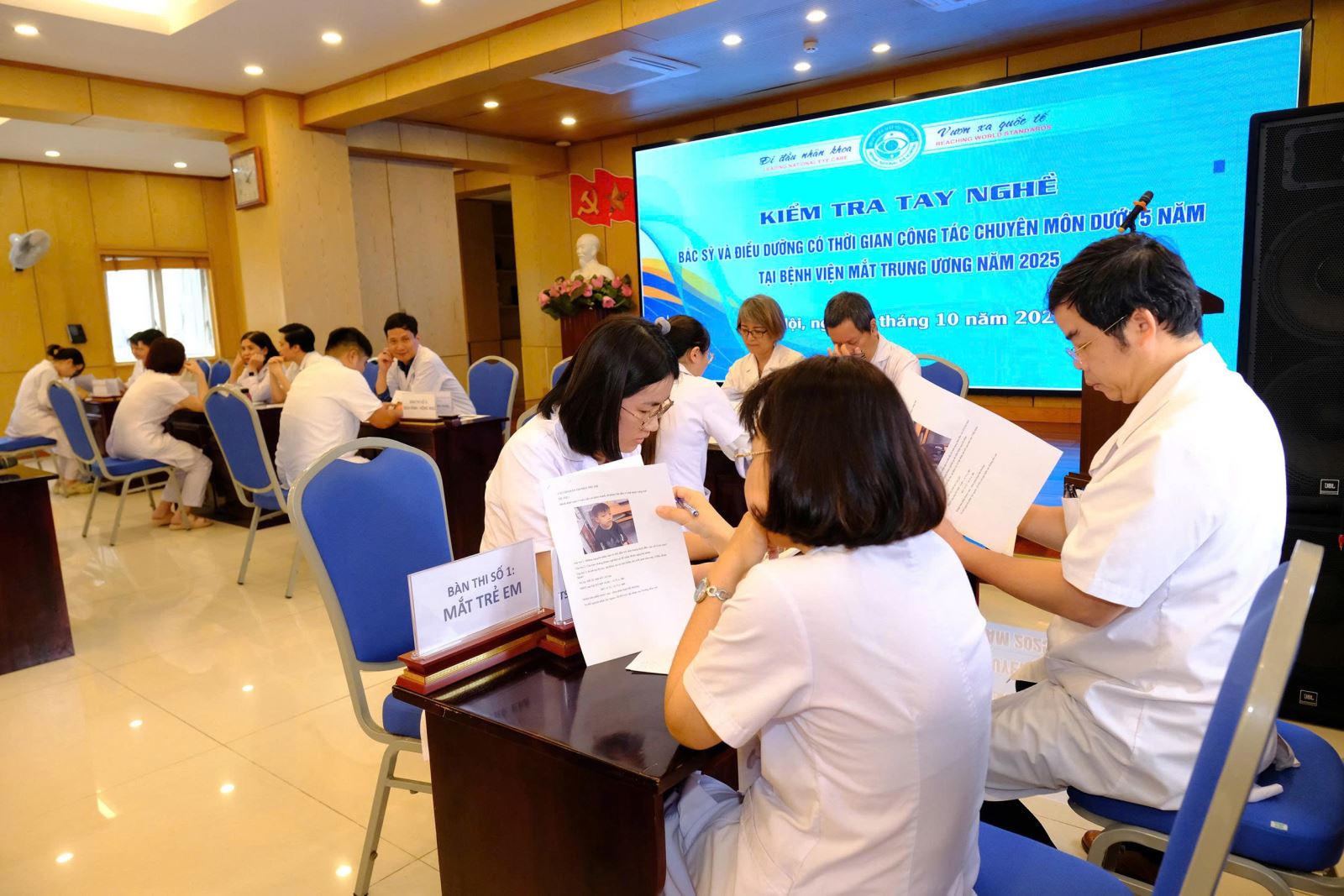 Các “thí sinh” tham gia kỳ kiểm tra phải trải qua các phần thi lý thuyết và thực hành nghiêm ngặt, do Hội đồng chuyên môn của Bệnh viện Mắt Trung ương trực tiếp chấm điểm, đánh giá toàn diện. Nội dung sát hạch kỳ này gồm nhiều chuyên ngành: Mắt trẻ em, Chấn thương, Dịch kính – Võng mạc, Glôcôm, Giác mạc, Khúc xạ – Thể thủy tinh, Gây mê hồi sức, và Chẩn đoán hình ảnh.