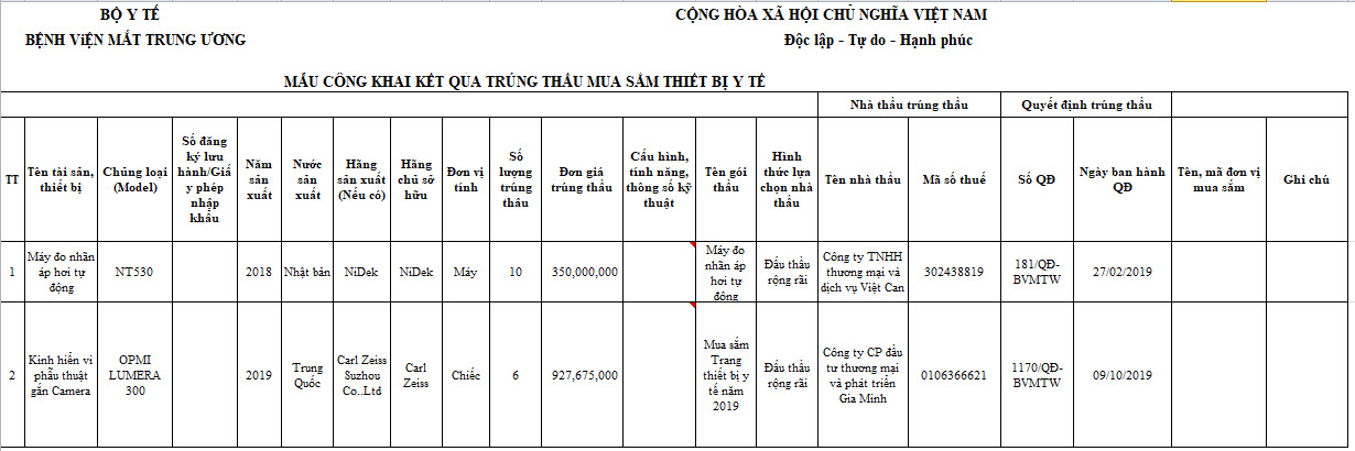 Bệnh viện Mắt TW - Công khai kết quả đầu thầu mua sắm thiết bị Y tế và Vật Tư tiêu hao năm 2019