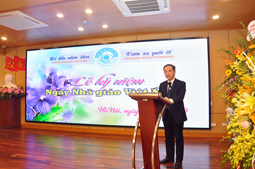 Phát biểu tại buổi lễ, PGS.TS. Nguyễn Xuân Hiệp – Giám đốc bệnh viện Mắt TW ôn lại truyền thống, ý nghĩa ngày Nhà giáo Việt Nam cũng như gửi lời chúc đến tất cả các thầy cô giáo, cán bộ và nhân viên của bệnh viện và các cơ sở đào tạo nhãn khoa, những người đã và đang vượt qua nhiều khó khăn góp phần xây dựng bệnh viện ngày càng phát triển và đóng góp cho sự nghiệp đào tạo cán bộ phòng chống mù lòa cả nước. PGS.TS. Nguyễn Xuân Hiệp cho biết Bệnh viện luôn xác định đào tạo là một trong những nhiệm vụ quan trọng hàng đầu. Lãnh đạo bệnh viện luôn dành sự quan tâm sâu sắc đến công tác đào tạo, đầu tư cơ sở vật chất, mở rộng các nội dung đào tạo, cải tiến nâng cao chất lượng chương trình đào tạo... Bên cạnh đó bệnh viện không ngừng mở rộng quan hệ hợp tác, cả trong nước và quốc tế. Hiện nay bệnh viện có quan hệ hợp tác đào tạo với nhiều nước như Nhật Bản, Hàn Quốc, Singapore, Thái Lan… Bệnh viện Mắt TW không chỉ là cơ sở đào tạo các học viên trong nước, mà còn có rất nhiều học viên nước ngoài đến từ châu Âu, Hàn Quốc, Mông Cổ, Lào… theo học. Đây là một bước tiến mới, một nỗ lực rất đáng ghi nhận trong công tác đào tạo của bệnh viện, góp phần nâng tầm ngành Nhãn khoa Việt Nam ngang hàng với các nước hàng đầu trong khu vực.