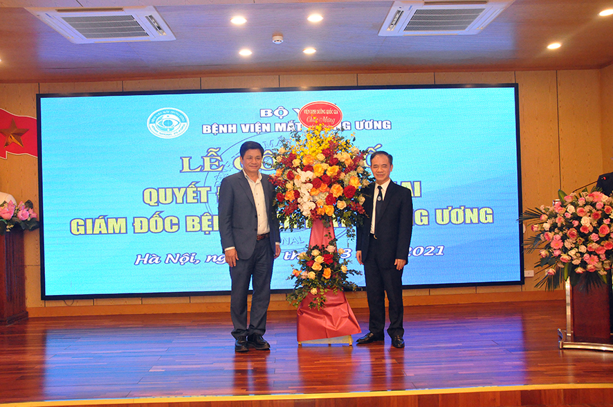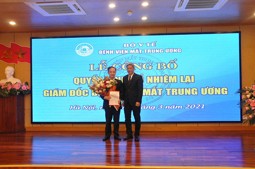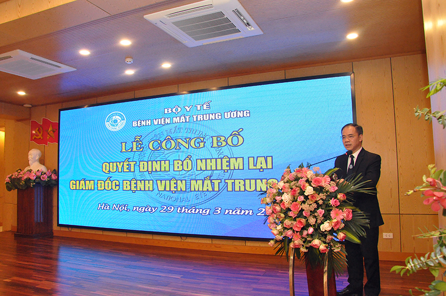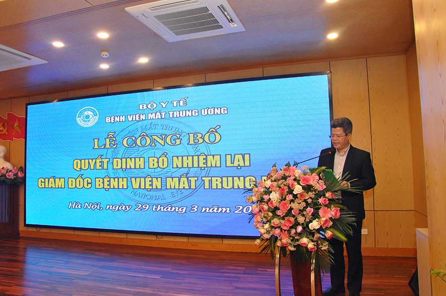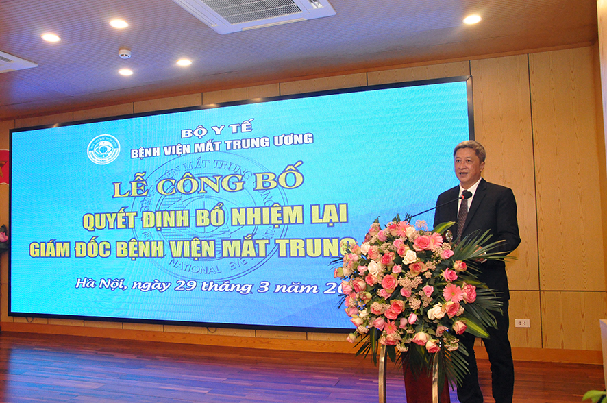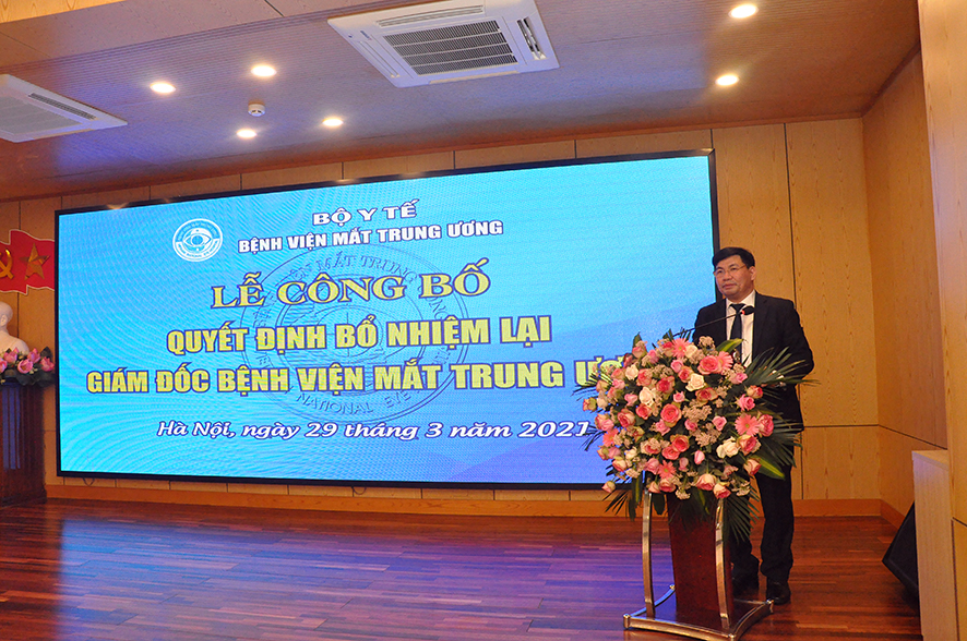 Tại buổi Lễ, được sự ủy quyền của Bộ trưởng Bộ Y tế, BS. Nguyễn Hồng Sơn - Vụ trưởng Vụ Tổ chức cán Bộ đã công bố Quyết định số 1666QĐ/BYT ngày 24/03/2021 của Bộ trưởng Bộ Y tế quyết định bổ nhiệm lại Giám đốc Bệnh viện Mắt Trung ương đối với PGS.TS. Nguyễn Xuân Hiệp. Quyết định có hiệu lực 05 năm kể từ ngày ký ban hành.