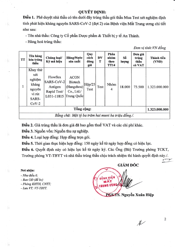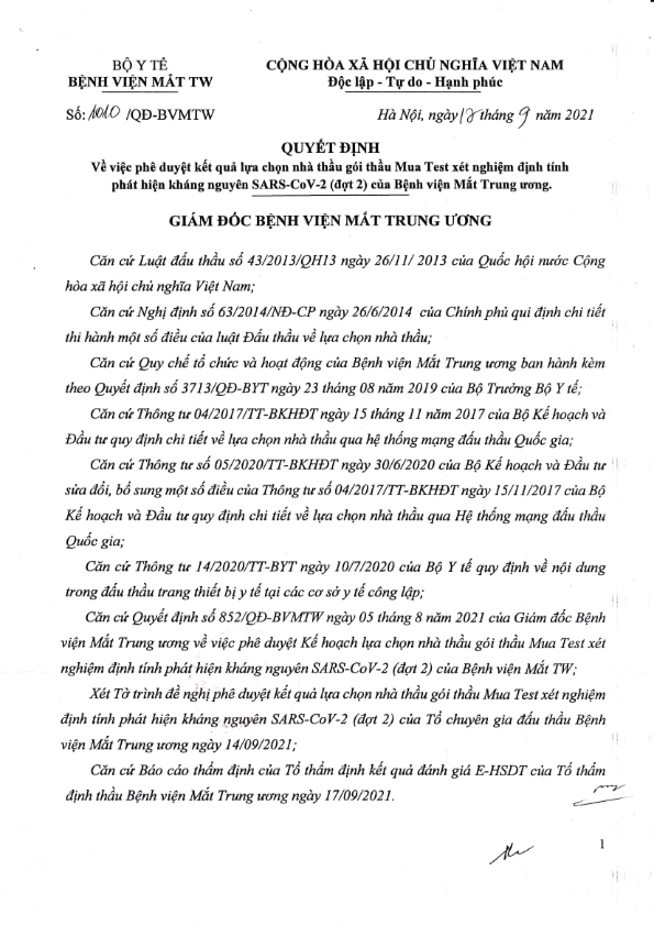 Phê duyệt nhà thầu có tên dưới đây trúng thầu gói thầu Mua Test xét nghiệm định tính phát hiện kháng nguyên SARS-CoV-2 (đợt 2) của Bệnh viện Mắt Trung ương chi tiết như sau: