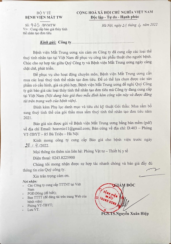 Thư mời báo giá mua sắm vật tư y tế