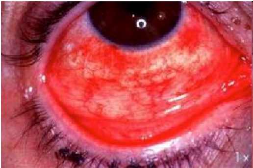 Viêm kết mạc hai mắt là dạng phổ biến nhất của viêm kết mạc do adeno virus gây ra. VKM biểu hiện đột ngột bằng đỏ mắt, ra gỉ mắt nhiều, thường kèm theo đau họng. Nên chẩn đoán phân biệt với: Viêm kết mạc do vi khuẩn chlamydia, các chủng virus khác và cả các viêm kết mạc do dị ứng nữa.