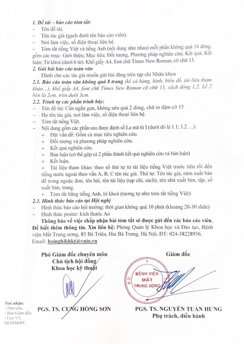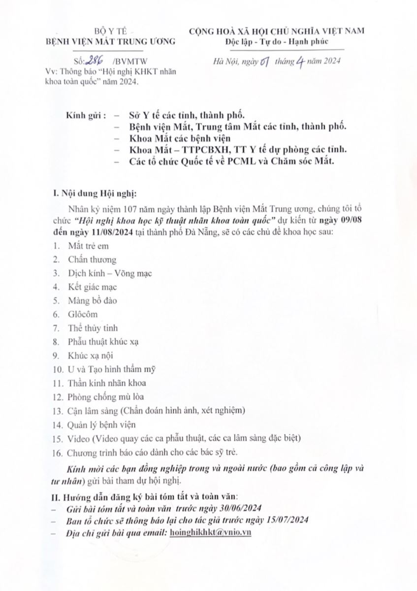 Thông báo: “Hội nghị khoa học kỹ thuật nhãn khoa toàn quốc” Nhân dịp kỷ niệm 107 năm thành lập Bệnh Viện Mắt Trung Ương. Dự kiến sẽ tổ chức từ ngày 9/8 đến 11/8/2024 tại Đà Nẵng. Kính mời tất cả đồng nghiệp trên toàn quốc đăng ký báo cáo và tham dự!