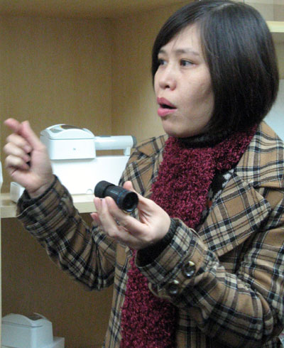 TS.BS Nguyễn Thị Thu Hiền, một trong những người tâm huyết với hoạt động chăm sóc mắt cho người khiếm thị hòa nhập cộng đồng tại Bệnh viện mắt TW, đang giới thiệu một số thiết bị trợ thị