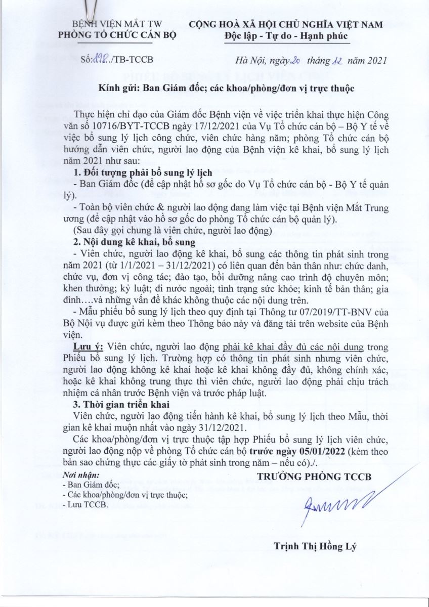 Thực hiện chỉ đạo của Giám đốc Bệnh viện về việc triển khai thực hiện Công văn số 10716/BYT-TCCB ngay 17/12/2021 của Vụ Tổ chức cán bộ - Bộ Y tế về việc bổ sung lý lịch công chức, viên chức hằng năm.