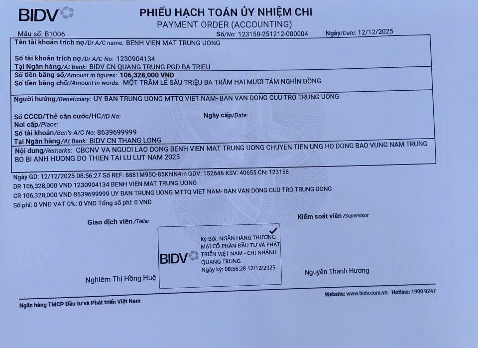 Số tiền 106.328.000 đồng từ Bệnh viện đã được chuyển về Ủy ban Trung ương Mặt trận Tổ quốc Việt Nam – Ban Vận động Cứu trợ Trung ương, nhằm hỗ trợ đồng bào miền Trung bị thiên tai năm 2025. Việc phân bổ cụ thể tới các địa phương sẽ được Ban Vận động Cứu trợ Trung ương cập nhật công khai.