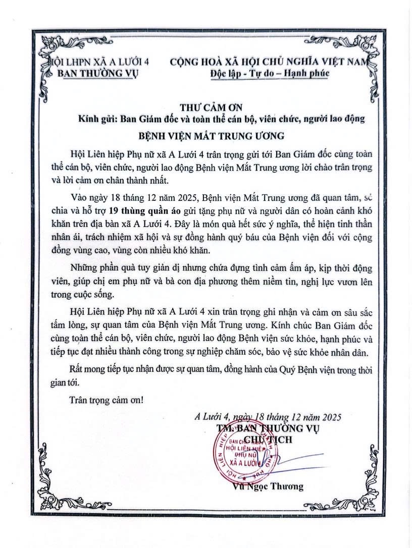 Bên cạnh hỗ trợ bằng tiền mặt, Bệnh viện đã phối hợp trao tặng 19 thùng quần áo đến người dân xã A Lưới 4, thành phố Huế, góp phần giúp bà con từng bước ổn định cuộc sống.