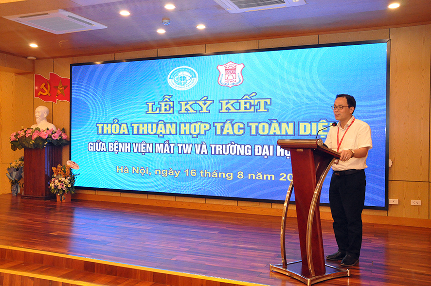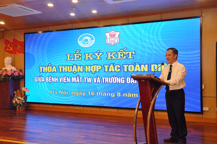 Phát biểu khai mạc buổi lễ, PGS.TS. Nguyễn Xuân Hiệp ôn lại truyền thống hợp tác giữa Bệnh viện Mắt TW và trường Đại học Y Hà Nội đã được vun đắp từ bao thế hệ thầy cô giáo, thầy thuốc nhãn khoa đi trước. PGS.TS. Nguyễn Xuân Hiệp bày tỏ lòng biết ơn công lao đào tạo của mái trường Đại học Y Hà Nội, ý thức trách nhiệm của bệnh viện, của các giảng viên thỉnh giảng hiện đang công tác tại bệnh viện trong sự nghiệp đào tạo các thế hệ sinh viên tiếp nối. Việc hợp tác đào tạo giữa trường Đại học Y Hà Nội với các bệnh viện cơ sở thực hành là một trong những hoạt động thường quy nhưng lễ ký kết lần này giữa 2 bên được nâng tầm trở thành sự hợp tác toàn diện, đánh dấu mốc son mới trong quan hệ hợp tác giữa nhà trường và bệnh viện. PGS.TS. Nguyễn Xuân Hiệp hy vọng trong thời gian tới với vị thế, uy tín đầu ngành của 2 đơn vị, công tác đào tạo các thế hệ sinh viên y khoa và cán bộ y tế nhãn khoa sẽ đạt được những kết quả thành công tốt đẹp.
