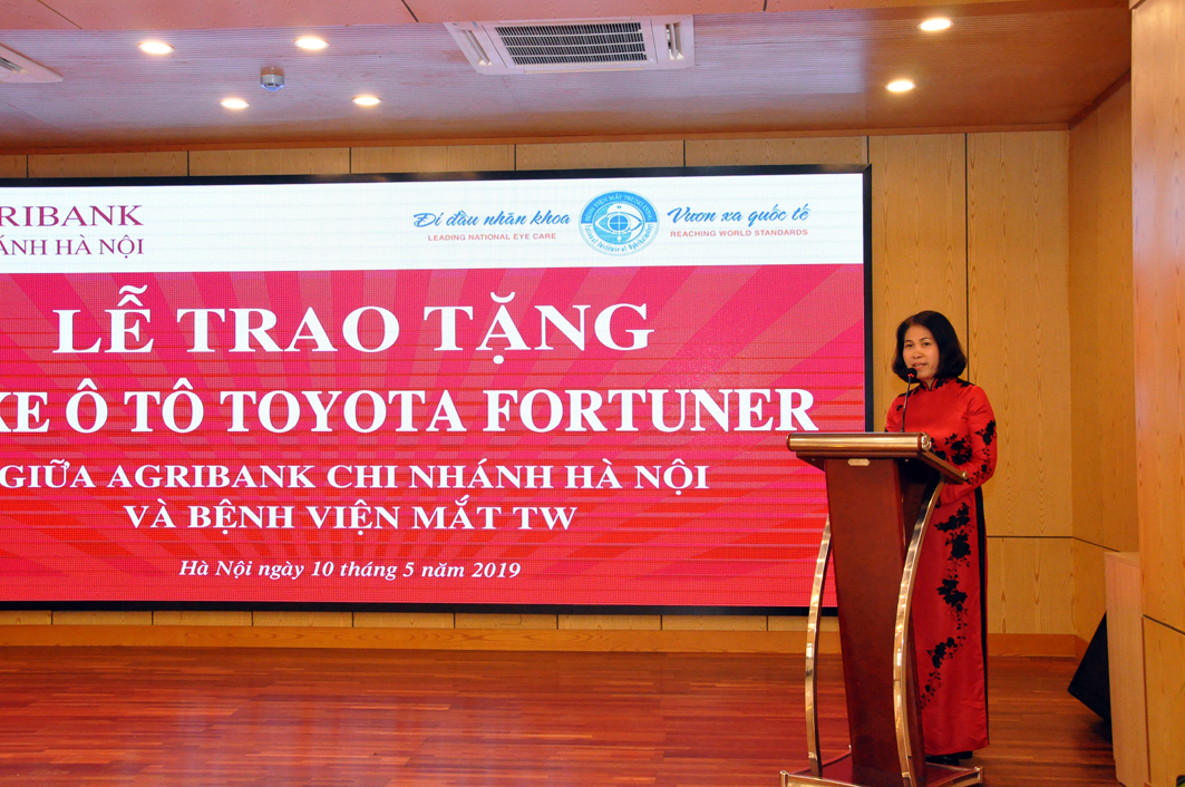Bà Phạm Thị Hằng - Giám đốc Ngân hàng NN&PTNT chi nhánh Hà Nội cho biết, trong nhiều năm qua Agribank chi nhánh Hà Nội luôn xác định và đi đầu thực hiện công tác an sinh xã hội, trong đó có các hoạt động tài trợ cho các bệnh viện và trường học trên địa bàn thành phố. Đây là món quà thể hiện tình cảm trách nhiệm của toàn thể lãnh đạo, cán bộ nhân viên của Agribank chi nhánh Hà Nội đối với ngành y tế nói chung và Bệnh viện Mắt TW nói riêng.