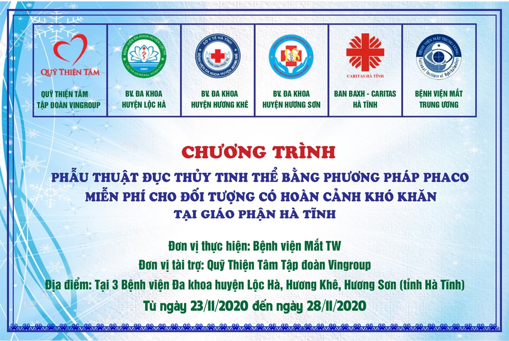Chương trình được thực hiện dưới sự tài trợ của Quỹ Thiện Tâm Tập Đoàn Vingroup, do các bác sỹ, nhân viên y tế Bệnh viện Mắt TW thực hiện, cùng với sự cộng tác, hướng dẫn của Caritas Hà Tĩnh. Bắt đầu từ ngày 23/11/2020 đến ngày 28/11/2020, tại 3 Bệnh viện huyện Lộc Hà, Hương Khê, Hương Sơn (Hà Tĩnh).