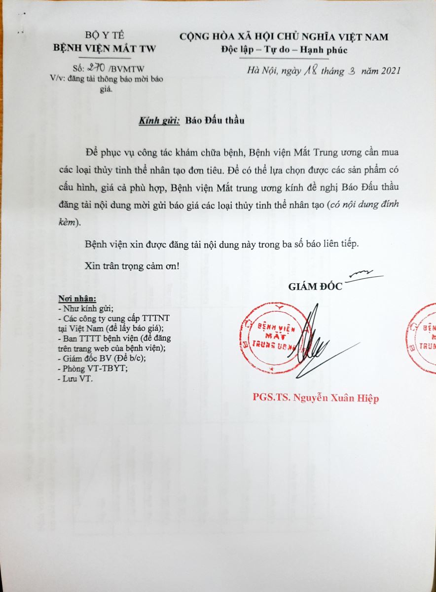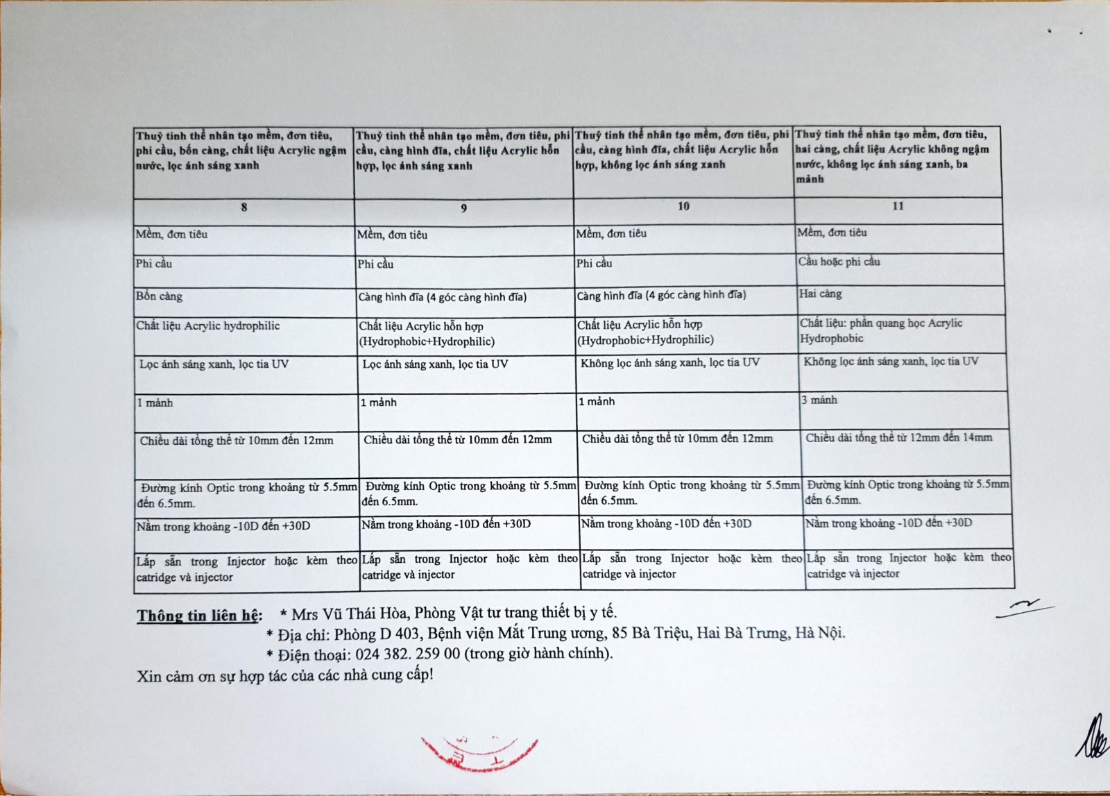 Bệnh viện Mắt TW cần mua các loại thủy tinh thể nhân tạo đơn tiêu để phục vụ công tác khám chữa bệnh, có các đặc điểm kỹ thuật trong danh sách dưới đây. Bệnh viện xin mời các nhà cung cấp gửi báo giá có catalog của sản phẩm, phân nhóm theo thông tư 14 của Bộ Y Tế về Bệnh viện. Xin gửi báo giá trước ngày 30/3/2021