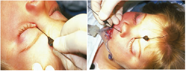 Thăm dò tắc nghẽn đường lệ. Bên trái : Đầu dò đi vào ống lệ quản dưới.  Bên phải : Một đầu thăm dò thứ hai đi vào các lỗ mũi.