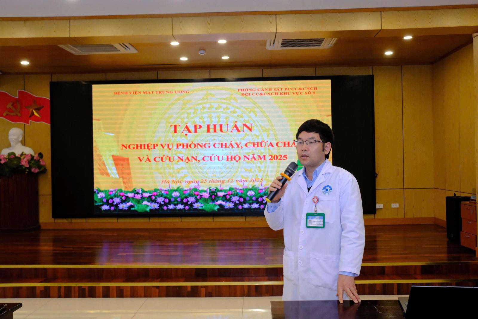 Phát biểu tại buổi tập huấn, TS. Hoàng Anh Tuấn, Phó Giám đốc Bệnh viện Mắt Trung ương, nhấn mạnh vai trò đặc biệt quan trọng của công tác phòng cháy, chữa cháy trong môi trường bệnh viện – nơi có không gian tương đối chật hẹp, cùng lưu lượng lớn người bệnh và người nhà người bệnh ra vào mỗi ngày. Theo đó, việc quan tâm, đầu tư cho công tác PCCC & CNCH được xác định là một trong những nhiệm vụ ưu tiên hàng đầu, cần được triển khai thường xuyên, liên tục và bài bản.