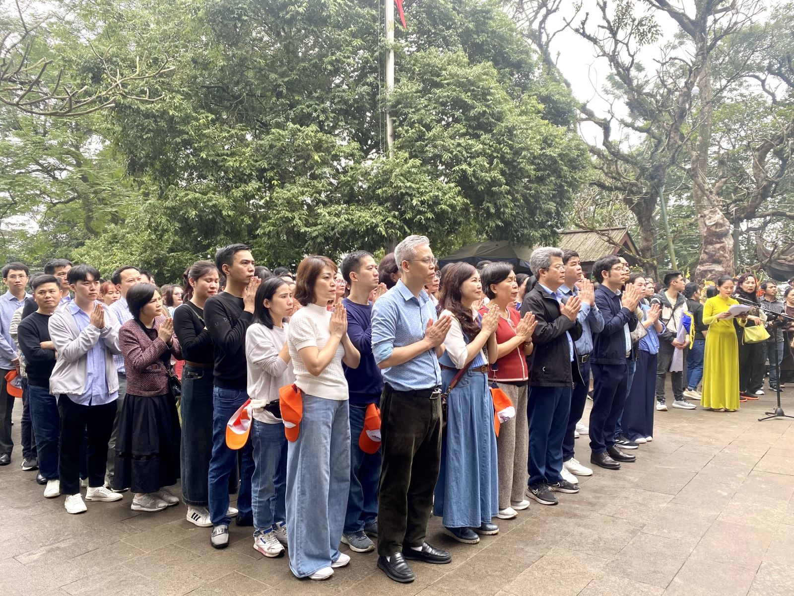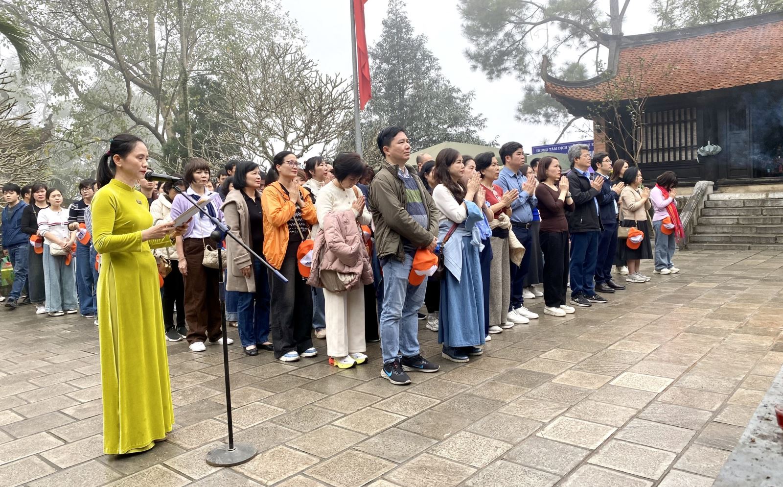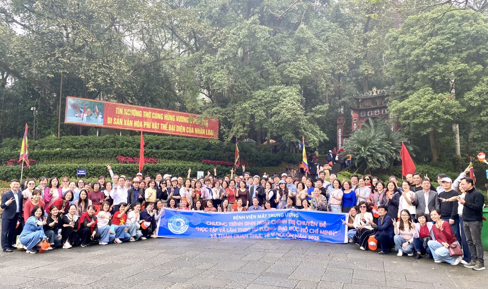 Sáng sớm hôm sau đoàn xuất phát hướng về Cụm di tích cuộc gia đặc biệt Đền Hùng. Dù chưa là chính hội nhưng từ khắp bốn phương trời, đồng bào Nam, Bắc, kiều bào Việt Nam cũng đã hành hương về Đất Tổ Phú Thọ để trẩy hội đền Hùng, tri ân công đức tổ tiên. Hành hương về đền Hùng chúng ta còn được chiêm ngưỡng những nét văn hóa cổ truyền, phát tích từ vùng quê trung du Phú Thọ được các hướng dẫn viên tận tình diễn xướng. Đầu tiên đoàn dừng chân ở đến Đền Hạ. Đây chính là nơi mẹ Âu Cơ sinh ra bọc trăm trứng, sau nở thành một trăm người con trai. Nguồn gốc “đồng bào” nghĩa là “cùng bọc” được bắt nguồn từ đây. Ngay dưới chân Đền Hạ là Nhà Bia . Đoàn thực sự xúc động khi đọc dòngchữ trên tấm bia đá:“Các Vua Hùng đã có công dựng nước/Bác cháu ta phải cùng nhau giữ lấy nước”. Đó là lời căn dặn của Chủ tịch Hồ Chí Minh khi Người về thăm Đền Hùng ngày 19/9/1954. Tiếp tục cuôc hành trình, đoàn đến Đền Trung (Hùng Vương Tổ miếu). Chúng tôi được biết: đây là nơi các Vua Hùng cùng các Lạc hầu, Lạc tướng ngắm cảnh và họp bàn việc nước, cũng là nơi vua Hùng thứ sáu đã nhường ngôi cho Lang Liêu - người con hiếu thảo có công làm ra bánh chưng, bánh dày. Tuy đã thấm mệt nhưng đa số các thành viên trong đoàn đã có mặt trên Đền Thượng và Lăng Hùng Vương trên đỉnh núi Hùng, còn gọi là núi Cả hay núi Nghĩa Lĩnh, có độ cao 175m so với mặt nước biển. Tại các điểm dừng chân đoàn đều dâng lễ, thắp hương tưởng nhớ công ơn của các bậc tiền nhân, cầu chúc cho đất nước yên bình và hưng thịnh.