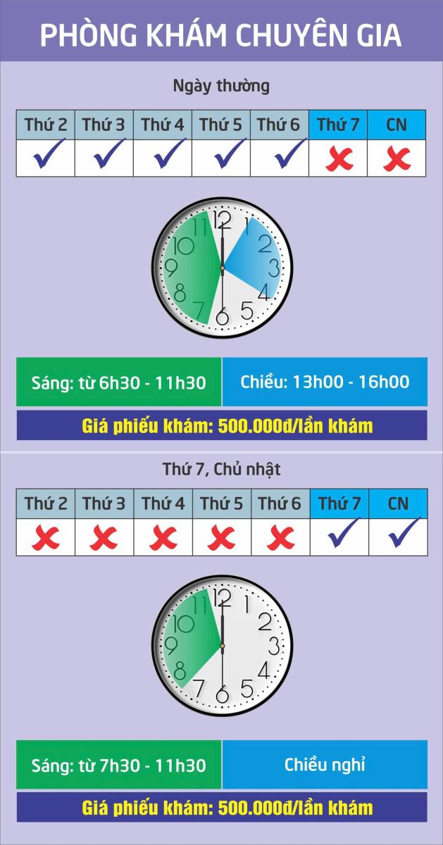 - Phòng khám ngoài giờ buổi chiều: bắt đầu từ 16h30 - 18h30